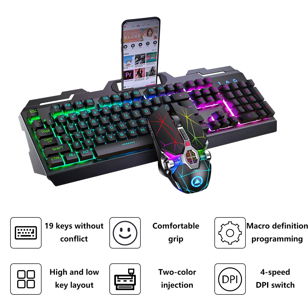 | Gaming Keyboard Mouse Set Wired Keyboard Mechanical Feel 3200 DPI Gaming Mouse with Rainbow Backlit Phone Holder For PC Laptop |