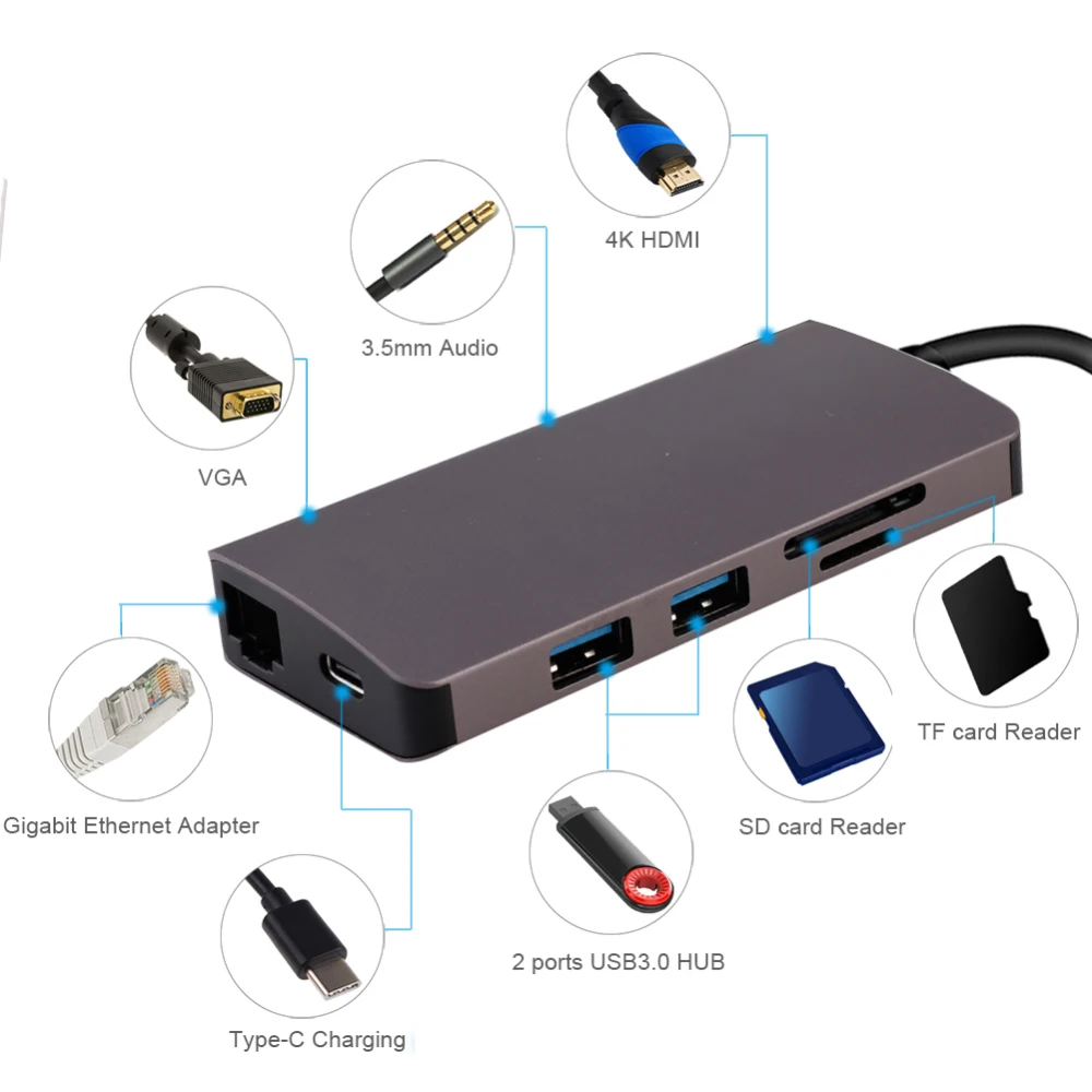 | USB C HUB to HDMI RJ45 VGA+AUDIO USB 3.0 SDTF Card Reader PD charging for MacBook Pro Pc for Huawei P20 Samsung USB C HUB |
