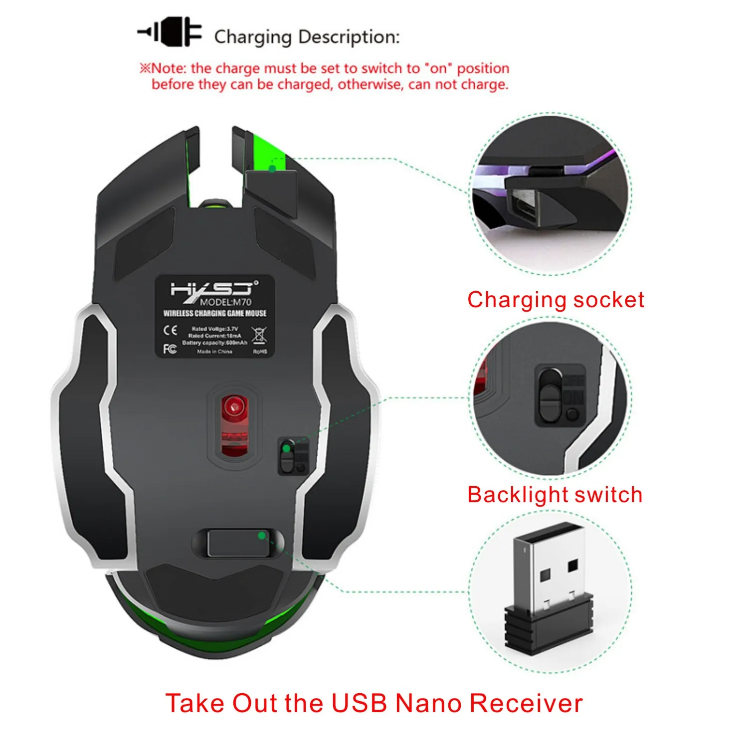 Wireless Mouse 2400 DPI Rechargeable Mouse 2.4G Wireless Gaming Mouse Ergonomics Mice Colorful Backlight Breathing Gamer Mause