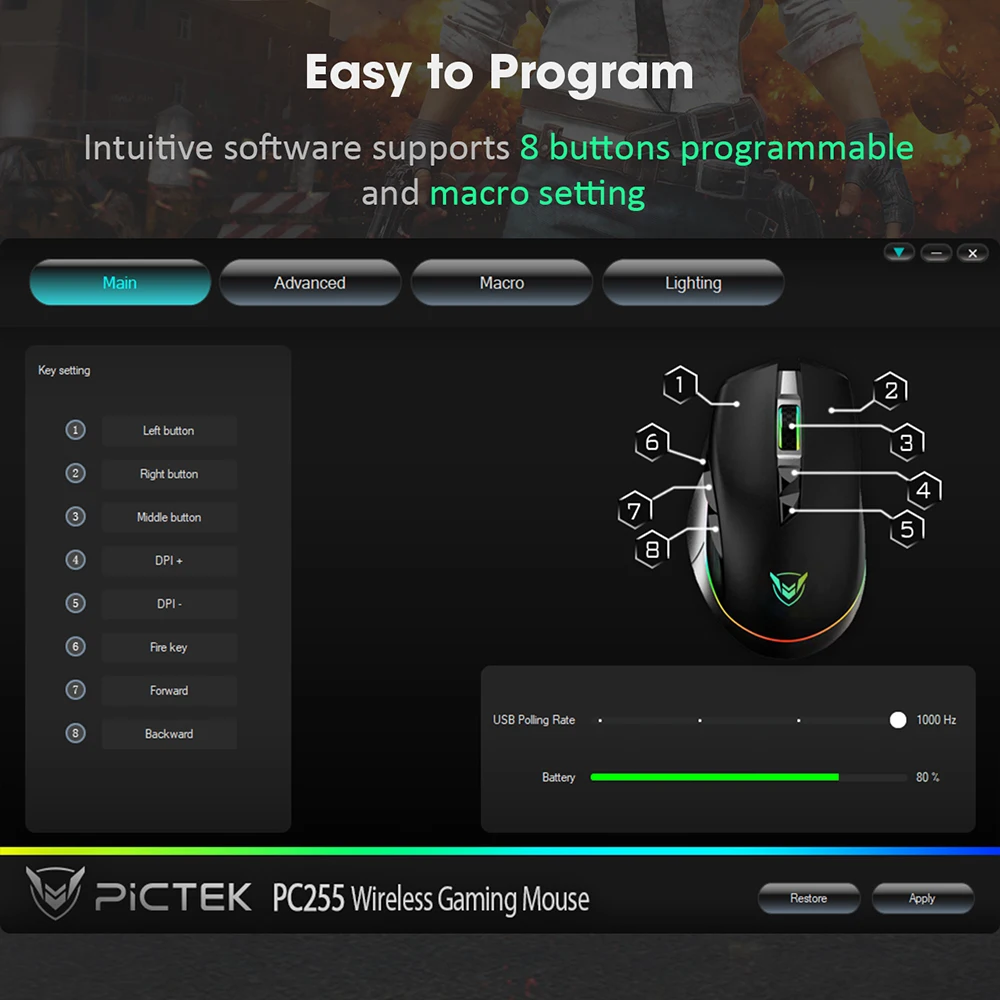 | PICTEK PC255 Gaming Mouse Wireless 10000 DPI RGB Mouse Rechargeable Ergonomic Computer Mice With 8 Programmable Buttons For PC |